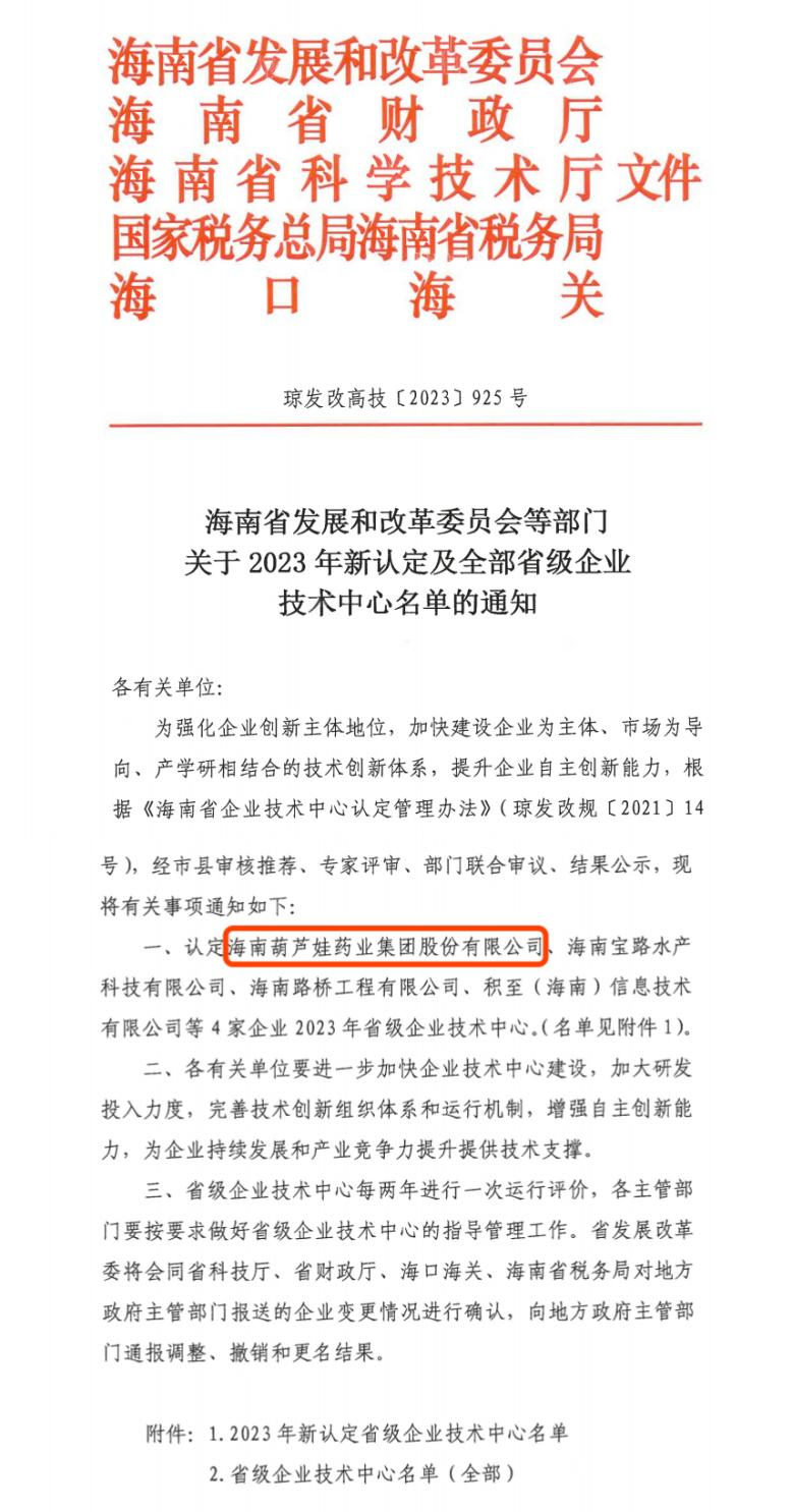 近日,海南省发改委等多部门联合公布了《关于2023年新认定及全部省级企业技术中心名单的通知》,其中,海南OG视讯药业集团股份有限公司成功通过评审,被认定为省级企业技术中心,是本次获批的4家企业之一。